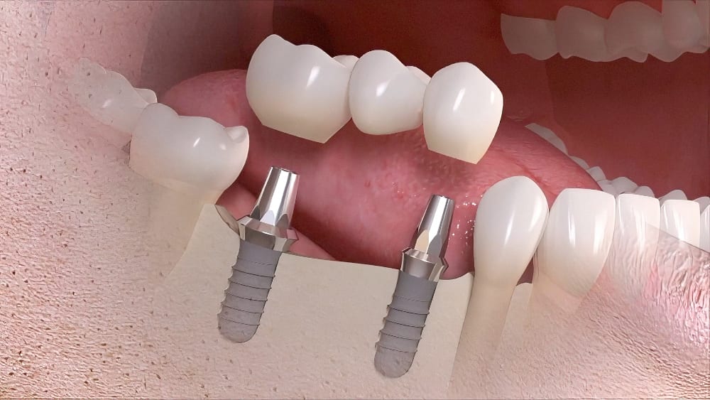 Exemple de 3 dents manquantes remplacées par un bridge sur implants.